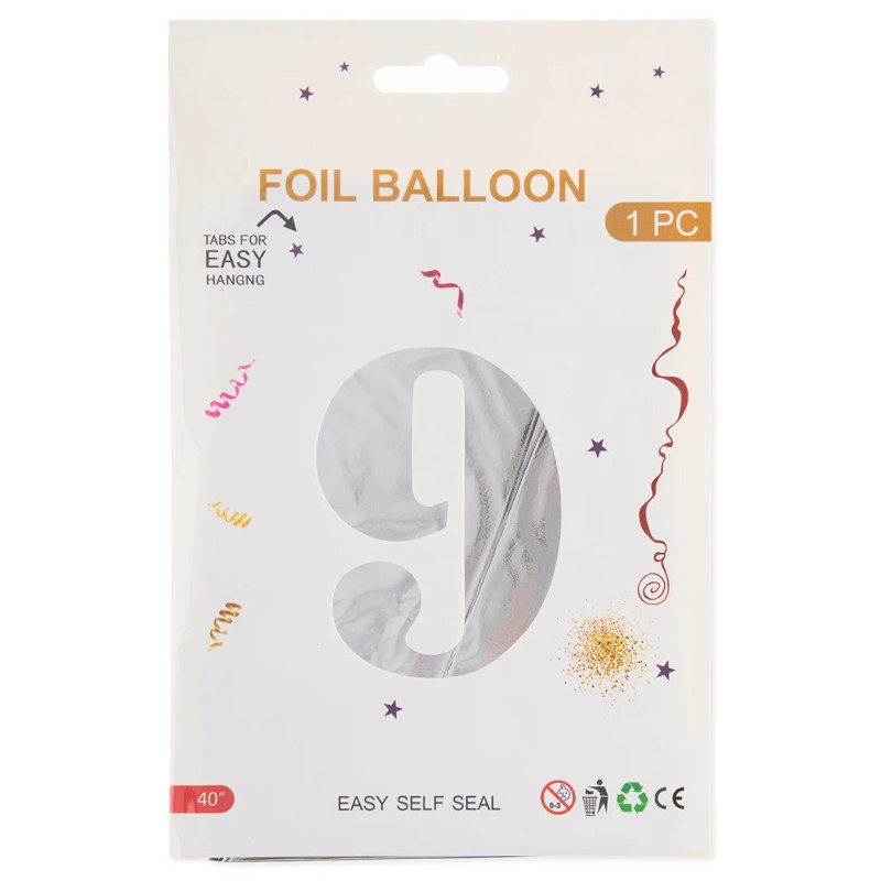 Шар (40''/102 см) Цифра, 9, Серебро, Металлик, 1 шт. в уп. СмайлБерри