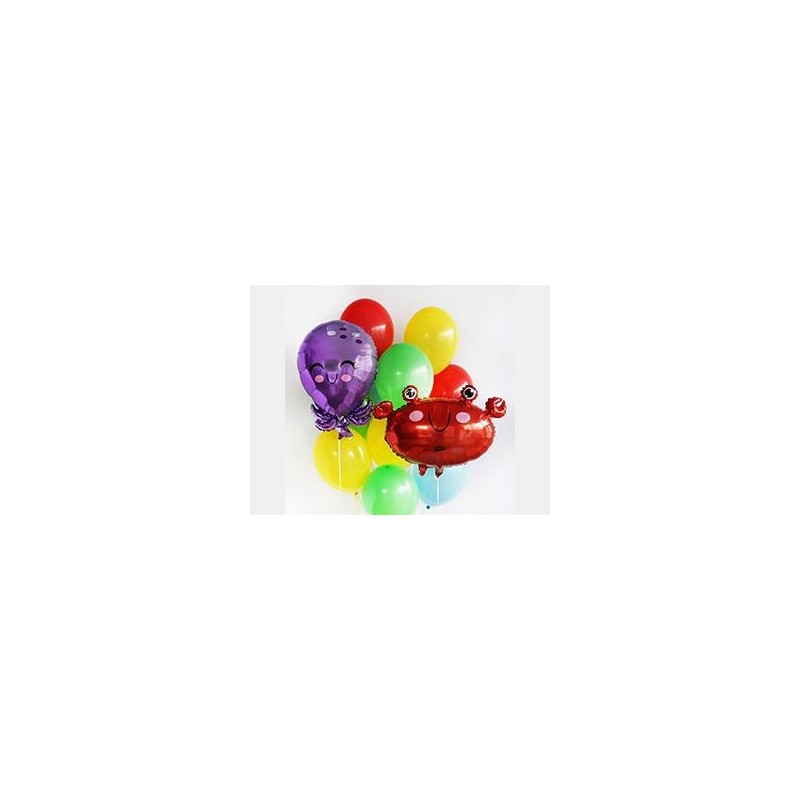 Сложная, объемная фигура в форме осьминога фиолетового цвета. При надувании рекомендуется использовать гелий. Шар имеет встроенный клапан - что упрощает надувание. Тонкая миларовая (фольга на полиэтиленовой основе) пленка позволяет шарам не сдуваться от недели до одного месяца. Размер фигуры 14"/35cm w x 21"/53cm h.