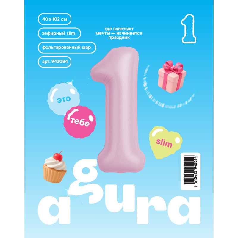 Шар (40''/102 см) Цифра, 1, Slim, Зефирный, в упаковке 1 шт. Россия